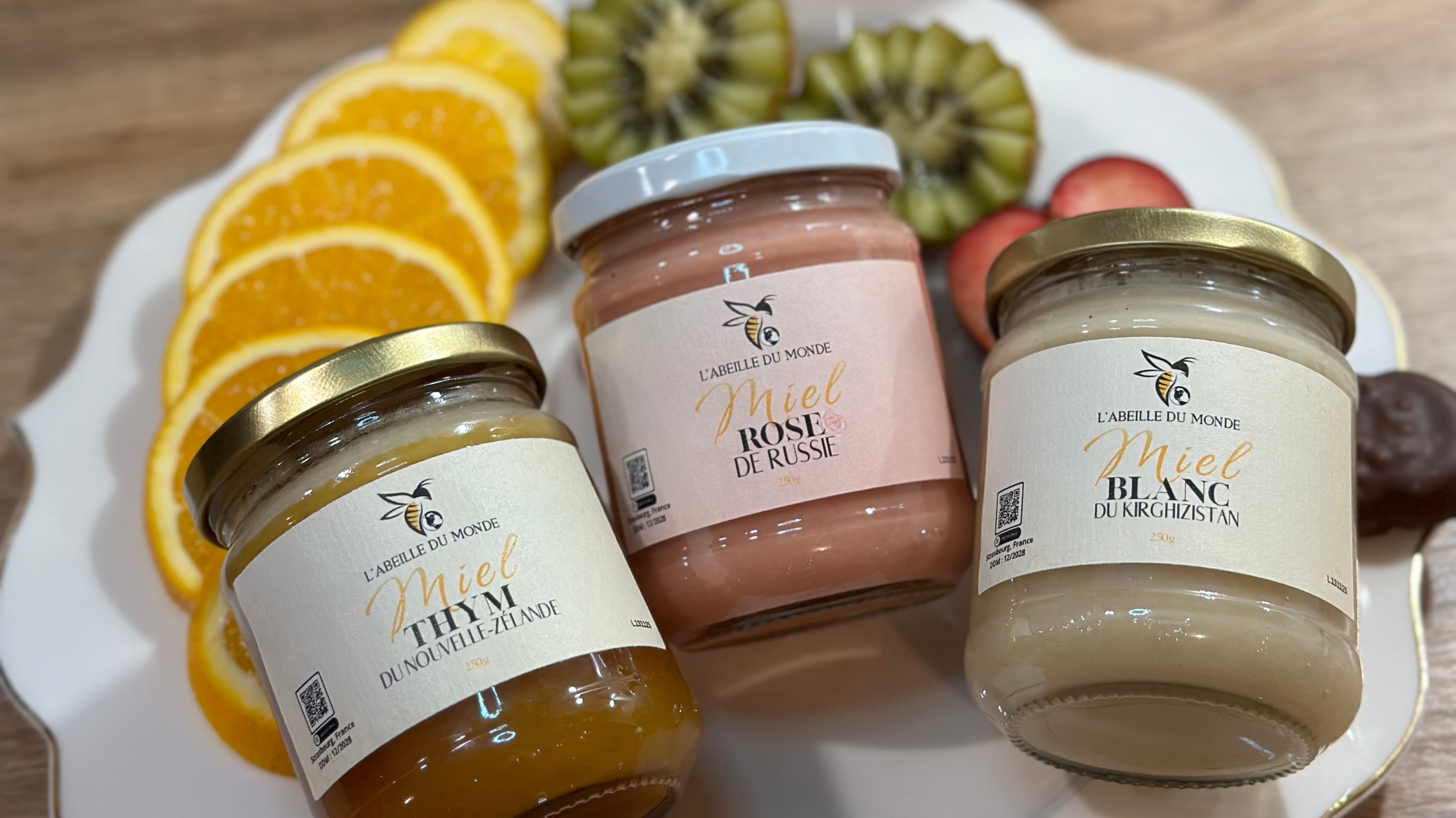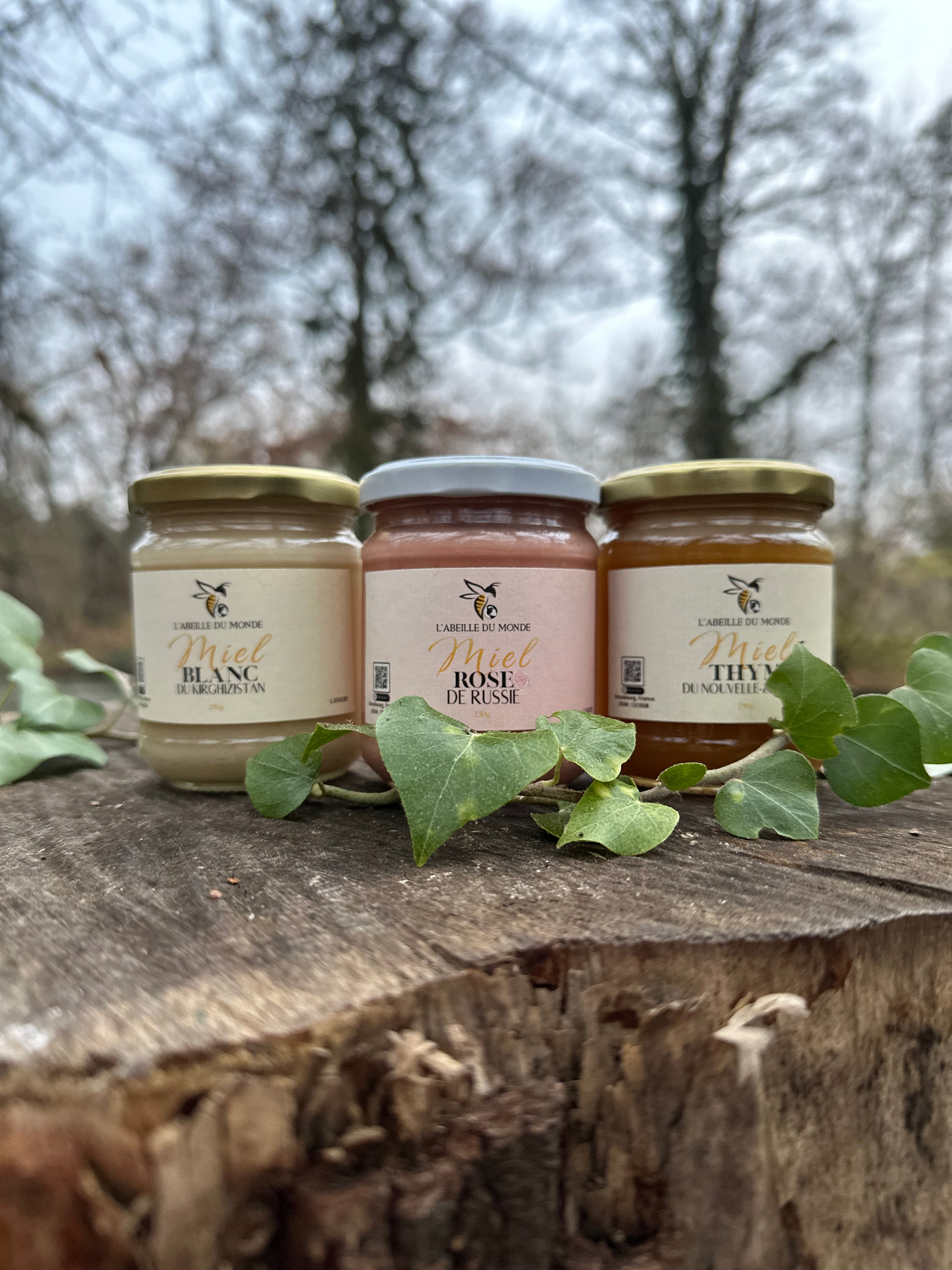 Nous proposons des miels rares comme le blanc du Kirghizistan, le rose de Russie et le thym de Nouvelle-Zélande.